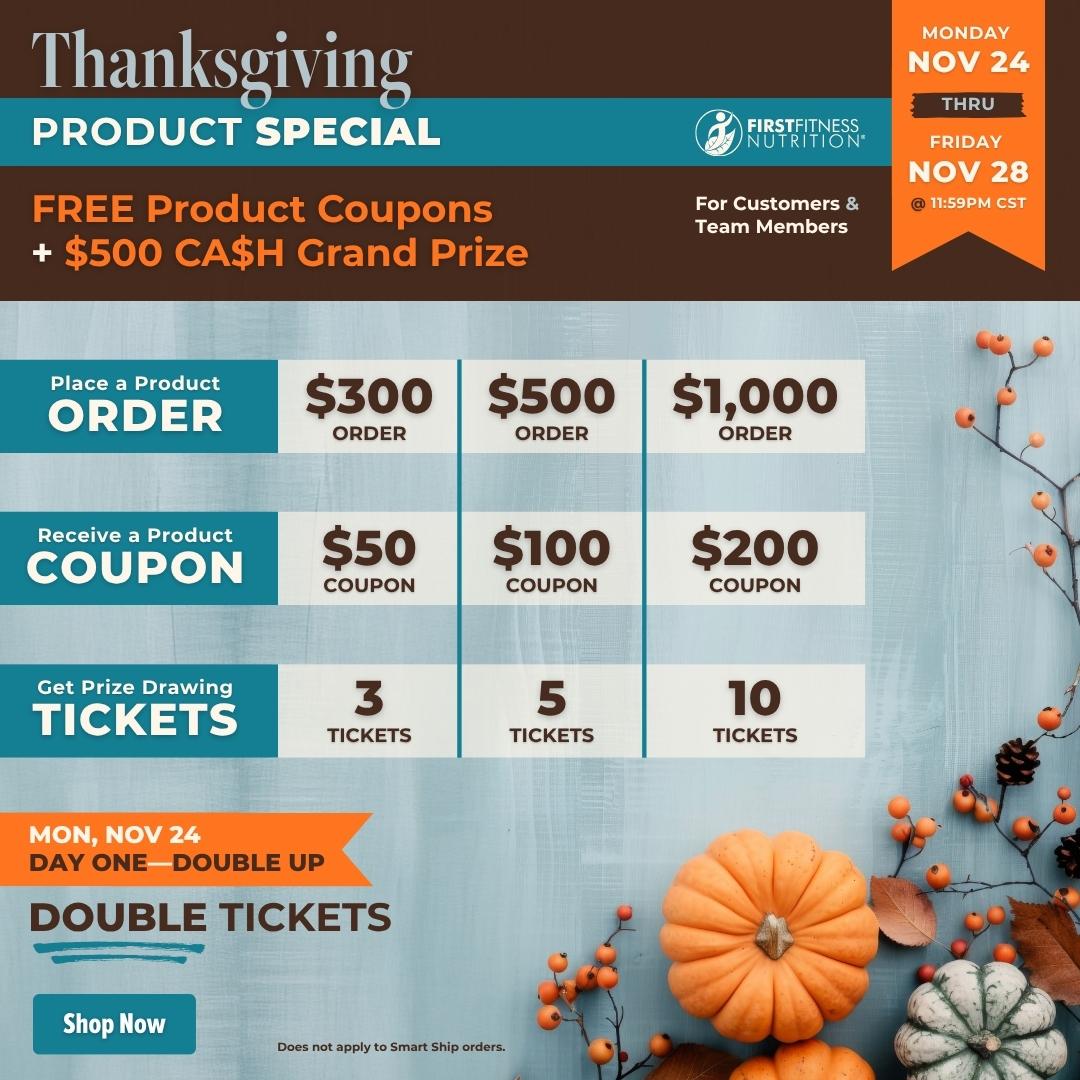 Thanksgiving Special! Free Product Coupons + $500 Giveaway—Double Entries Today! LEARN MORE
